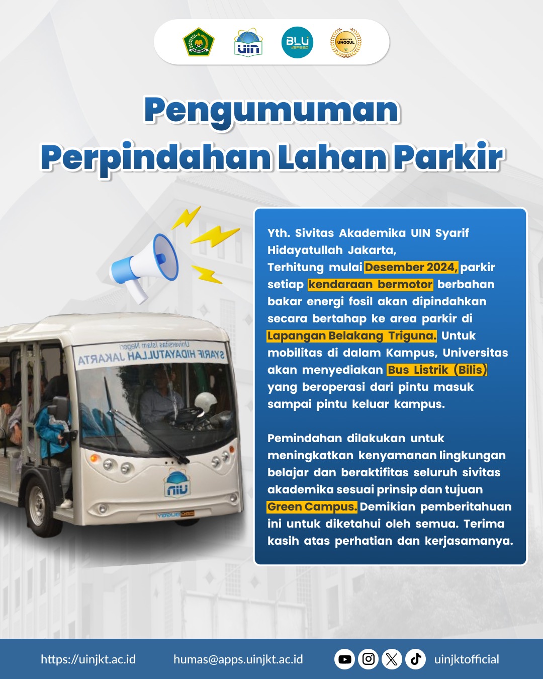 Starting December 2024, fossil fuel-powered motor vehicle parking in the Campus I area will be gradually moved to the parking area at Lapangan Bawah Triguna.